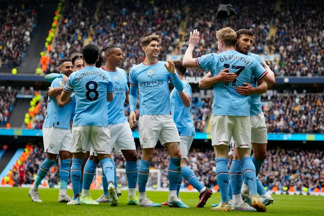 Manchester City's Kevin De Bruyne, second from right, is congratulated by teammates after scoring his his side's 2nd goal during the English Premier League soccer match between Manchester City and Liverpool at Etihad stadium in Manchester, England, Saturday, April 1, 2023.,Image: 766539108, License: Rights-managed, Restrictions: This content is intended for editorial use only. For other uses, additional clearances may be required., Model Release: no, Pictured: Kevin De Bruyne