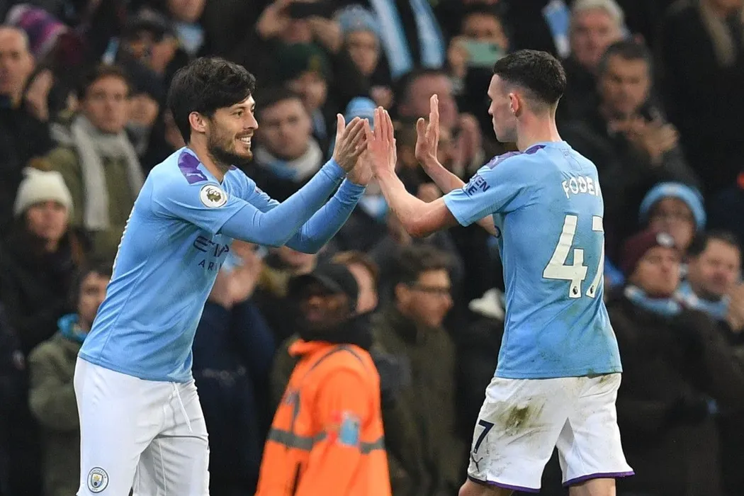 Manchester City's Spanish midfielder David Silva (L) replaces Manchester City's English midfielder Phil Foden during the English Premier League football match between Manchester City and Everton at the Etihad Stadium in Manchester, north west England, on January 1, 2020., Image: 490539637, License: Rights-managed, Restrictions: RESTRICTED TO EDITORIAL USE. No use with unauthorized audio, video, data, fixture lists, club/league logos or 'live' services. Online in-match use limited to 120 images. An additional 40 images may be used in extra time. No video emulation. Social media in-match use limited to 120 images. An additional 40 images may be used in extra time. No use in betting publications, games or single club/league/player publications., Model Release: no, Credit line: Paul ELLIS / AFP / Profimedia