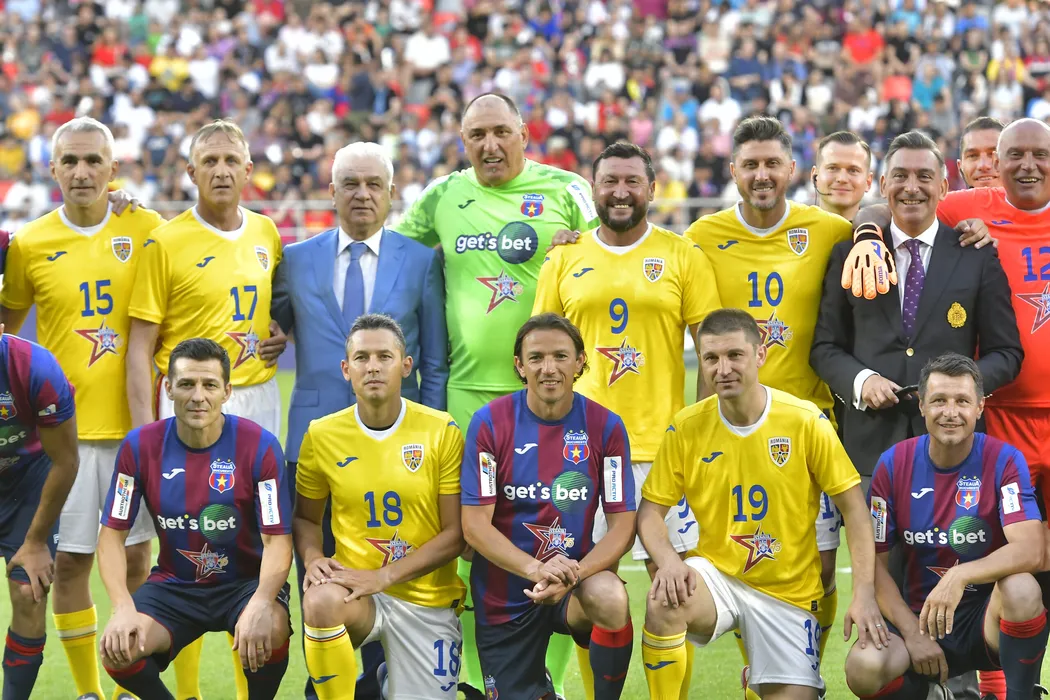 Adrian Iencsi, Emil Sandoi, Anghel Iordanescu, Dumitru Stangaciu, Viorel Moldovan, Ciprian Marica, Ilie Dumitrescu, Florin Prunea, Constantin Galca, Paul Florentin Codrea, George Ogararu, Andrei Cristea si Iulian Ilie Miu la o fotografie de grup realizata inaintea meciului de fotbal dintre Legende Steaua Bucuresti si Legende Romania desfasurat cu ocazia implinirii a 75 de ani de existenta a clubului militar, pe Stadionul Ghencea-Steaua din Bucuresti, marti 7 iunie 2022. © FOTO:Razvan Pasarica/SPORT PICTURES