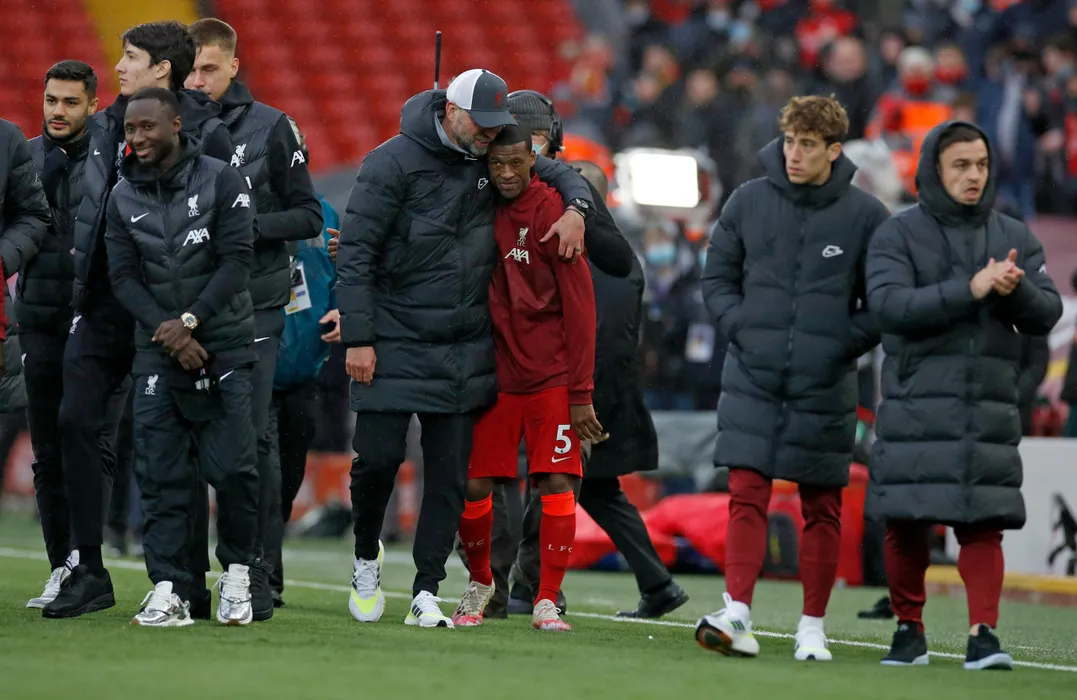 Liverpool's German manager Jurgen Klopp embraces Liverpool's Dutch midfielder Georginio Wijnaldum after the English Premier League football match between Liverpool and Crystal Palace at Anfield in Liverpool, north west England on May 23, 2021.,Image: 612293447, License: Rights-managed, Restrictions: RESTRICTED TO EDITORIAL USE. No use with unauthorized audio, video, data, fixture lists, club/league logos or 'live' services. Online in-match use limited to 120 images. An additional 40 images may be used in extra time. No video emulation. Social media in-match use limited to 120 images. An additional 40 images may be used in extra time. No use in betting publications, games or single club/league/player publications., Model Release: no, Credit line: Profimedia