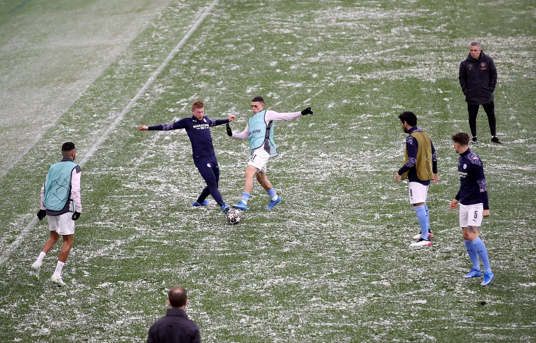 Manchester City's Kevin De Bruyne and Phil Foden (right) warm up on the pitch before the UEFA Champions League Semi Final second leg at the Etihad Stadium, Manchester. Picture date: Tuesday May 4, 2021.,Image: 609254340, License: Rights-managed, Restrictions: Editorial use only, no commercial use without prior consent from rights holder., Model Release: no, Credit line: Profimedia