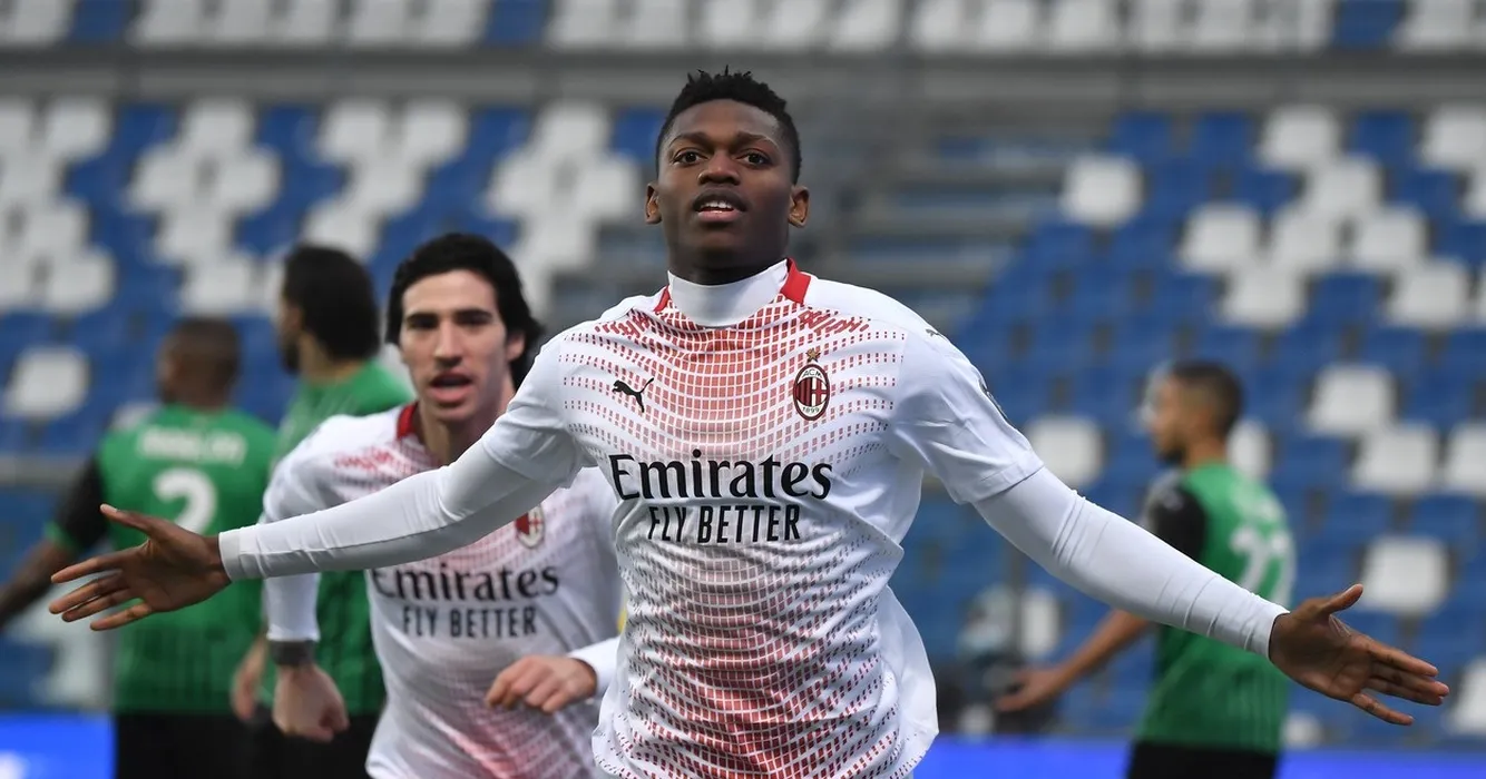 Rafael Leao of AC Milan celebrates after scoring the goal of 0-1 during the Serie A football match between US Sassuolo and AC Milan at Citta del Tricolore stadium in Reggio Emilia (Italy), December 20th 2020. Photo Andrea Staccioli / Insidefoto/Sipa USA,Image: 577488736, License: Rights-managed, Restrictions: *** World Rights Except Germany, Italy, Japan, and The Netherlands ***, Model Release: no