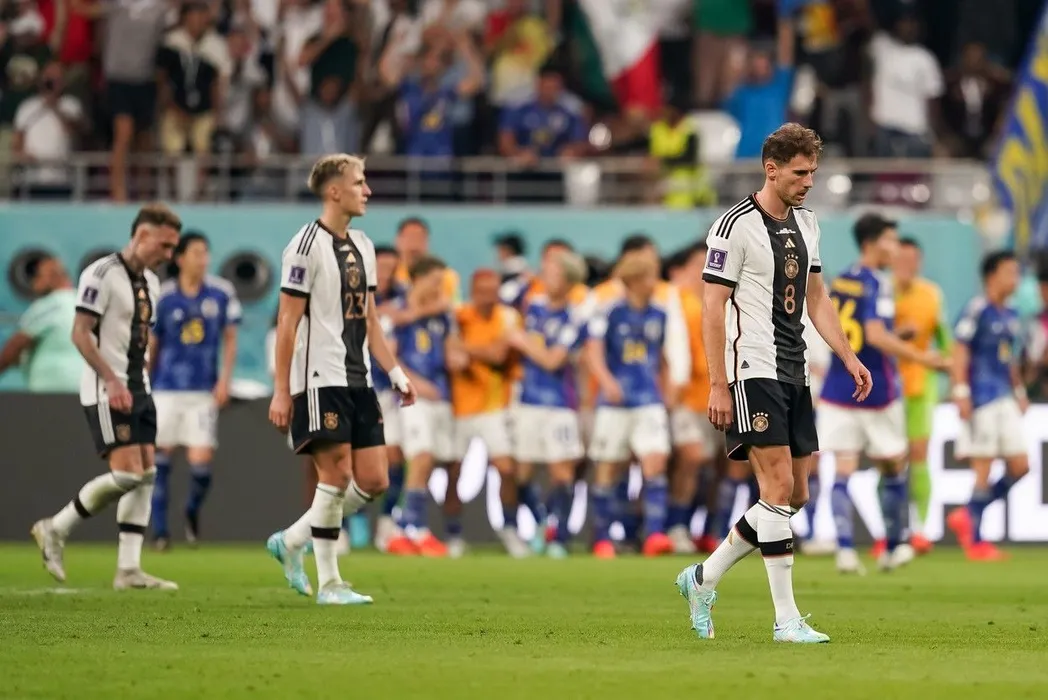 Khalifa International Stadium DOHA, QATAR - NOVEMBER 23: Player of Germany Leon Goretzka and Nico Schlotterbeck react as Japan's players (back) celebrate after scoring a goal during the FIFA World Cup Qatar 2022 group E match between Germany and Japan at Khalifa International Stadium on November 23, 2022 in Doha, Qatar. (Photo by Florencia Tan Jun/PxImages) (Florencia Tan Jun / SPP)