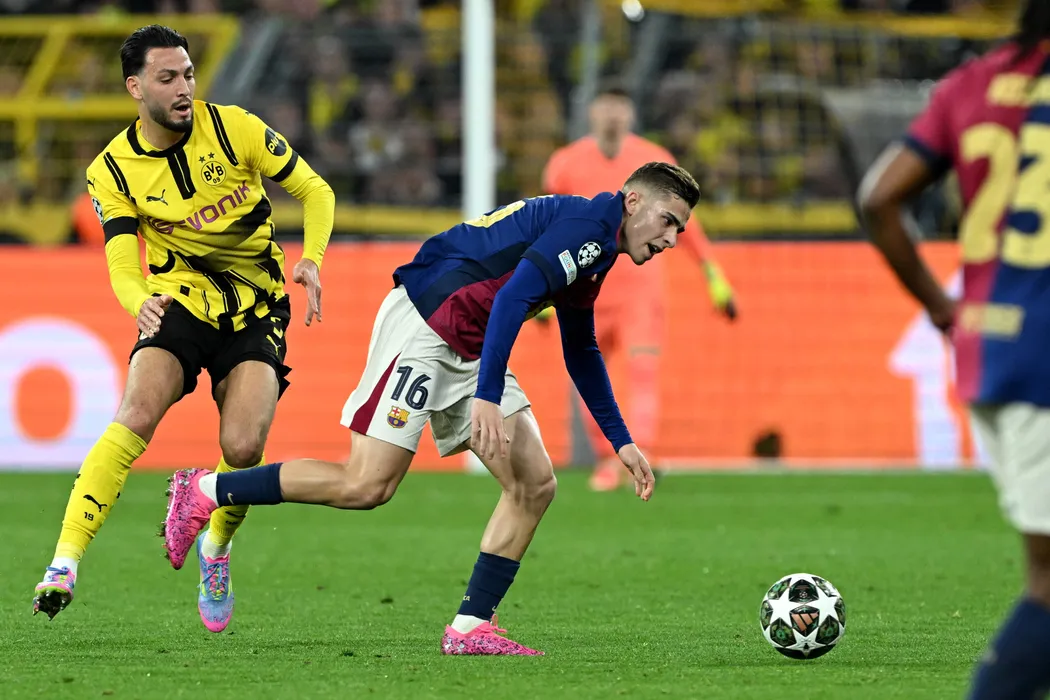15 April 2025, North Rhine-Westphalia, Dortmund: Dortmund's Ramy Bensebaini (L) and Barcelona's Fermin Lopez battle for the ball during the UEFA Champions League quarter-final second leg soccer match between Borussia Dortmund and FC Barcelona at the Signal Iduna Park. Photo: Federico Gambarini/dpa