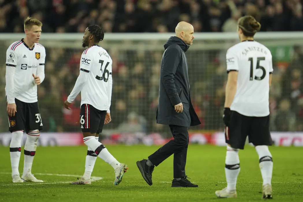 Manchester United's head coach Erik ten Hag leaves the pitch after the the English Premier League soccer match between Liverpool and Manchester United at Anfield in Liverpool, England, Sunday, March 5, 2023. Liverpool won the match 7-0. (AP Photo/Jon Super)