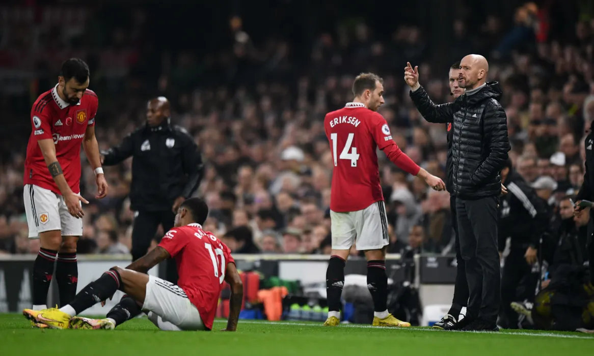 Football - 2022 / 2023 Premier League - Fulham vs Manchester United, ManU - Craven Cottage - Sunday 13th November 2022 Manchester United manager Erik Ten Hag gestures after a challenge on Marcus Rashford. COLORSPORT/ASHLEY WESTERN PUBLICATIONxNOTxINxUK