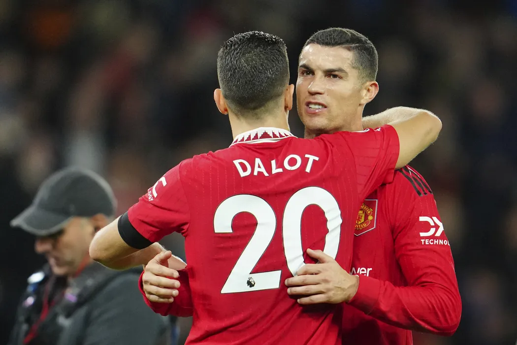 Manchester United's Diogo Dalot, foreground. And Manchester United's Cristiano Ronaldo celebrate at the end of the English Premier League soccer match between Manchester United and West Ham United at Old Trafford stadium in Manchester, England, Sunday, Oct. 30, 2022. (AP Photo/Jon Super)