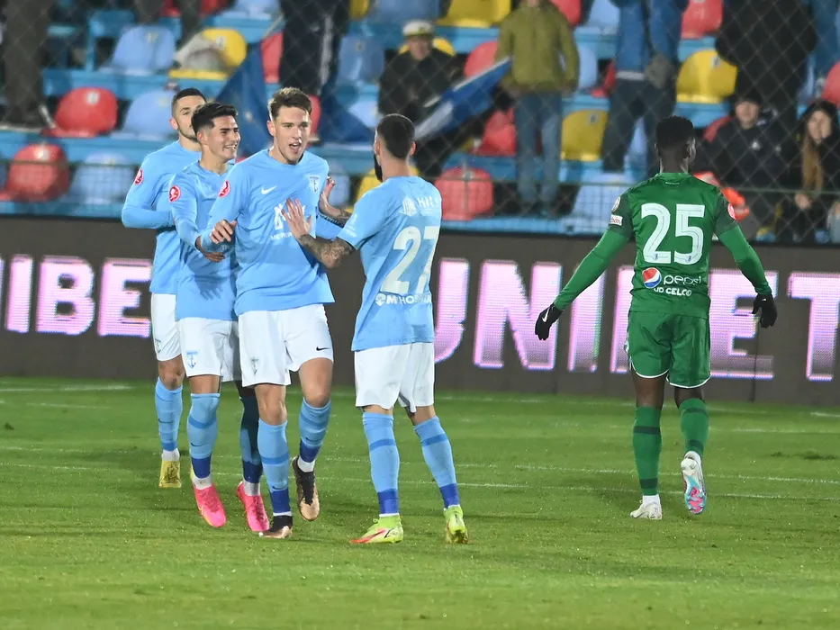 Bucurie a fotbalistilor voluntareni dupa un gol marcat cu Doru Cristian Andreisi Robert Marian Popescu in meciul de fotbal dintre FC Voluntari si Farul Constanta, din cadrul Superligii Superbet, desfasurat pe Stadionul Anghel Iordanescu din Voluntari, sambata 25 noiembrie 2023. © FOTO:Razvan Pasarica/SPORT PICTURES