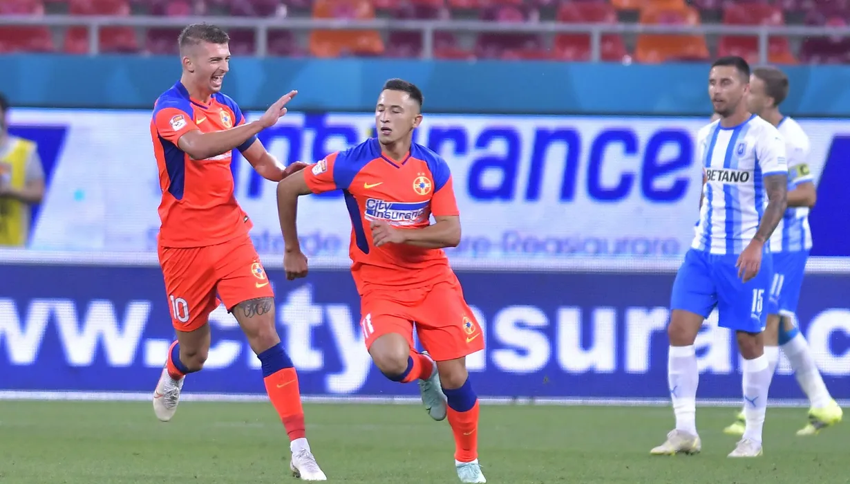 Bucurie a fotbalistilor stelisti dupa un gol marcat cu Florin Lucian Tanase si Olimpiu Vasile Morutan in meciul de fotbal dintre FCSB si Universitatea Craiova, contand pentru Liga 1 Casa Pariurilor, desfasurat pe Arena Nationala din Bucuresti, duminica 25 iulie 2021. © FOTO:Razvan Pasarica/SPORT PICTURES