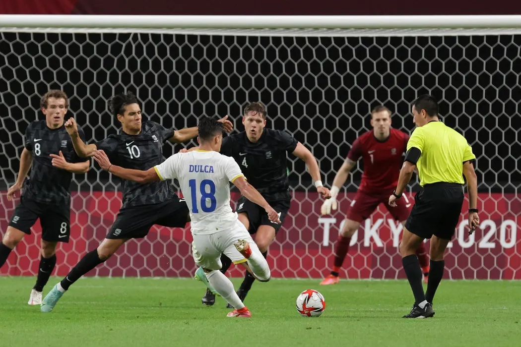 Romania's midfielder Marco Dulca (C) shoots and fails to score as New Zealand's midfielder Marko Stamenic (2nd L) and New Zealand's defender Nando Pijnaker (3rd R) defends during the Tokyo 2020 Olympic Games men's group B first round football match between Romania and New Zealand at the Sapporo Dome in Sapporo on July 28, 2021.,Image: 623832201, License: Rights-managed, Restrictions: , Model Release: no, Credit line: Profimedia