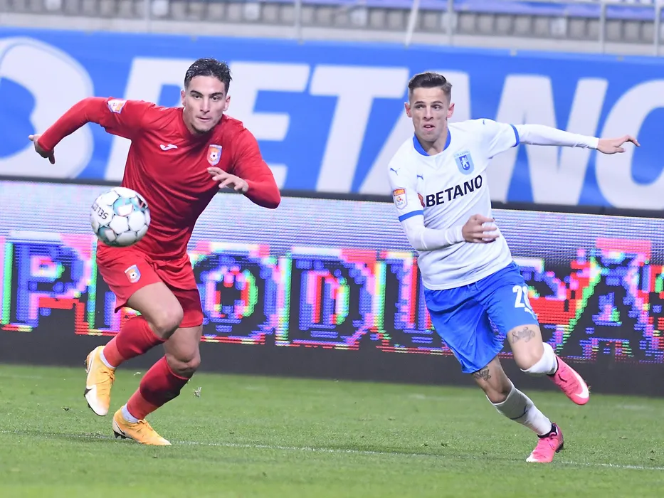 Marco Alexandru Dulca si Alexandru George Cimpanu in meciul de fotbal dintre Universitatea Craiova si Chindia Targoviste, contand pentru Liga 1 Casa Pariurilor, desfasurat fara spectatori pe Stadionul Ion Oblemenco din Craiova, vineri 6 noiembrie 2020. © FOTO:Razvan Pasarica/SPORT PICTURES