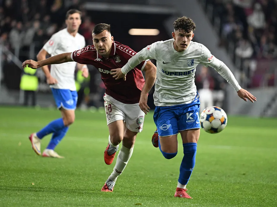 Luka Gojkovic si Luca Nicolae Banu in meciul de fotbal dintre Rapid Bucuresti si Farul Constanta, din cadrul Superligii Superbet, desfasurat pe Superbet Arena-Giulesti din Bucuresti, sambata 4 octombrie 2025. © FOTO:Razvan Pasarica/SPORT PICTURES