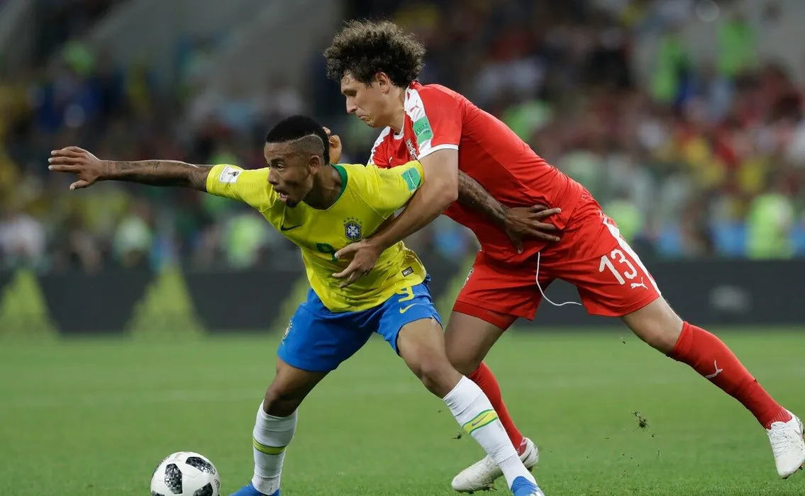 Brazil's Gabriel Jesus, left, is challenged by Serbia's Milos Veljkovic during the group E match between Serbia and Brazil, at the 2018 soccer World Cup in the Spartak Stadium in Moscow, Russia, Wednesday, June 27, 2018.,Image: 577244284, License: Rights-managed, Restrictions: This content is intended for editorial use only. For other uses, additional clearances may be required., Model Release: no, Pictured: Andre,Gabriel Jesus,Milos Veljkovic