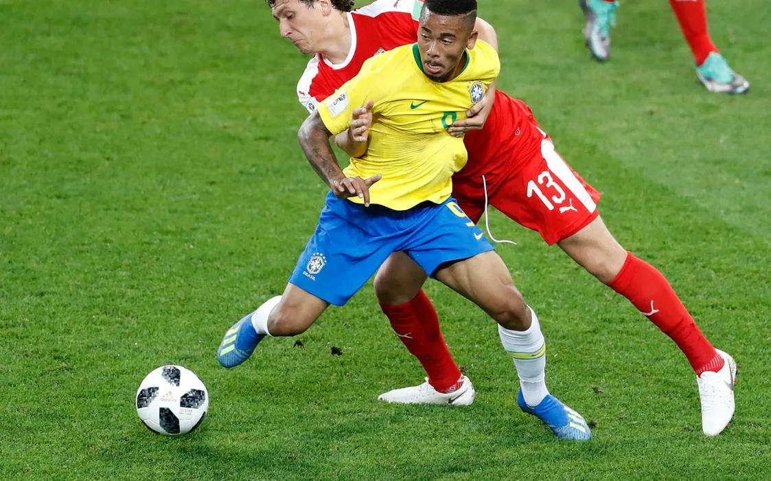 Brazil's Gabriel Jesus, front, and Serbia's Milos Veljkovic challenge for the ball during the group E match between Serbia and Brazil, at the 2018 soccer World Cup in the Spartak Stadium in Moscow, Russia, Wednesday, June 27, 2018.,Image: 577244280, License: Rights-managed, Restrictions: This content is intended for editorial use only. For other uses, additional clearances may be required., Model Release: no, Pictured: Gabriel Jesus,Milos Veljkovic