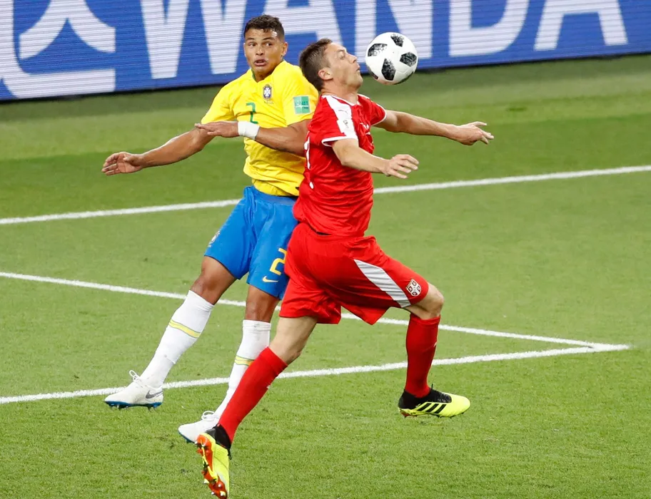 Brazil's Thiago Silva, left, and Serbia's Aleksandar Mitrovic go for a header during the group E match between Serbia and Brazil, at the 2018 soccer World Cup in the Spartak Stadium in Moscow, Russia, Wednesday, June 27, 2018.,Image: 577244283, License: Rights-managed, Restrictions: This content is intended for editorial use only. For other uses, additional clearances may be required., Model Release: no, Pictured: Aleksandar Mitrovic,Thiago