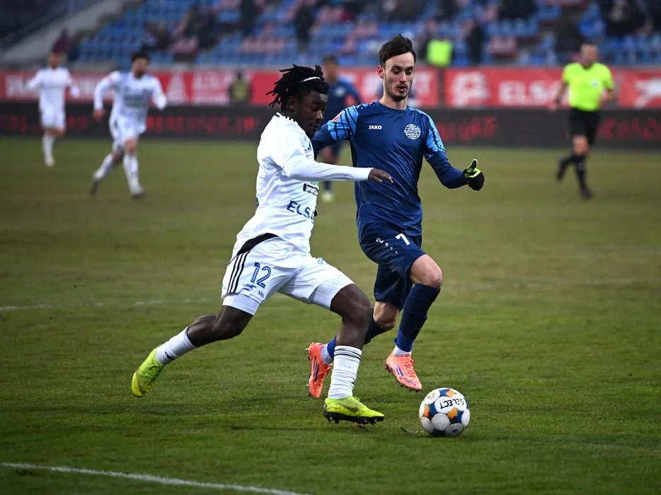 Friday Adams centreaza de langa Laurentiu Marian Lis pentru autogolul marcat de Andrei Sava in meciul de fotbal dintre FC Botosani si FC Metaloglobus Bucuresti, contand pentru Superliga Superbet, desfasurat pe Stadionul Municipal din Botosani, duminica 8 februarie 2026. © FOTO:Tudy/SPORT PICTURES