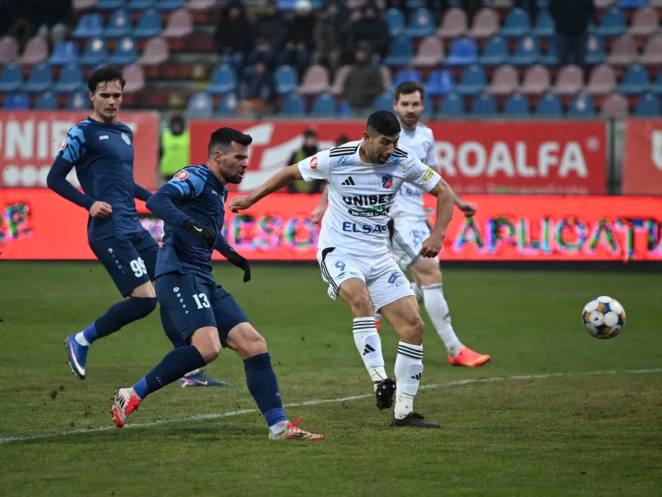 Enzo Adrian Lopez si Andrei Sava, Robert Gabriel Badescu in meciul de fotbal dintre FC Botosani si FC Metaloglobus Bucuresti, contand pentru Superliga Superbet, desfasurat pe Stadionul Municipal din Botosani, duminica 8 februarie 2026. © FOTO:Tudy/SPORT PICTURES