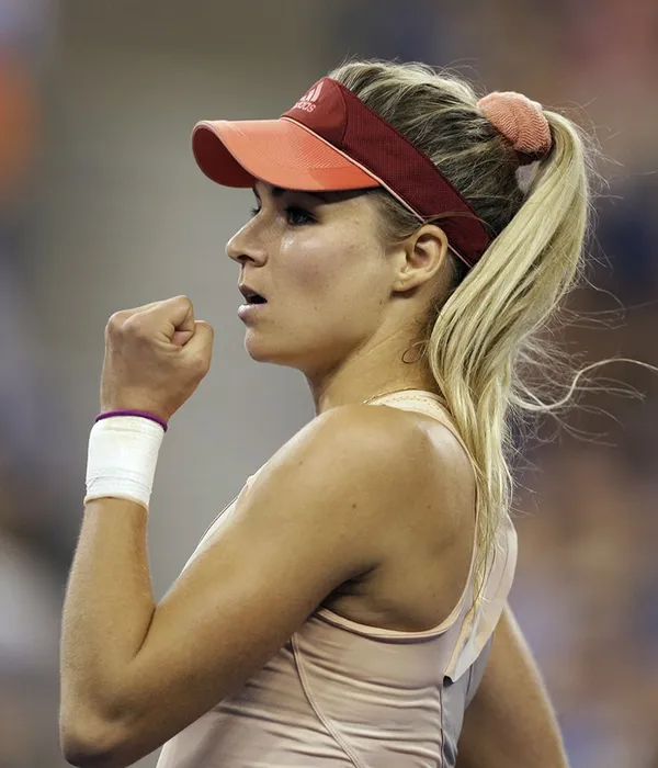 Maria Kirilenko (Washington Capitals' Alexander Ovechkin), of Russia, reacts after winning a point against Maria Sharapova, of Russia, during the opening round of the U.S. Open tennis tournament Monday, Aug. 25, 2014, in New York. (AP Photo/Darron Cummings)