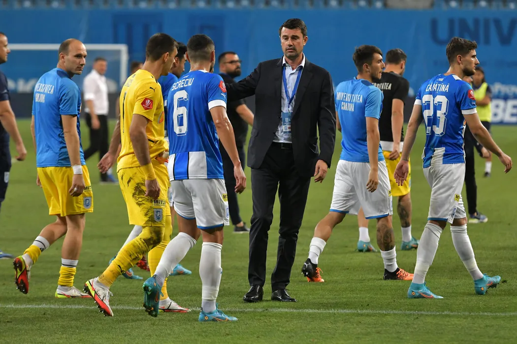 Marian Copilu ii felicita pe fotbalistii craioveni dupa meciul de fotbal dintre Universitatea Craiova si KF Vllaznia, din cadrul UEFA Europa Conference League, desfasurat pe Stadionul Ion Oblemenco din Craiova, joi 28 iulie 2022. © FOTO:Razvan Pasarica/SPORT PICTURES
