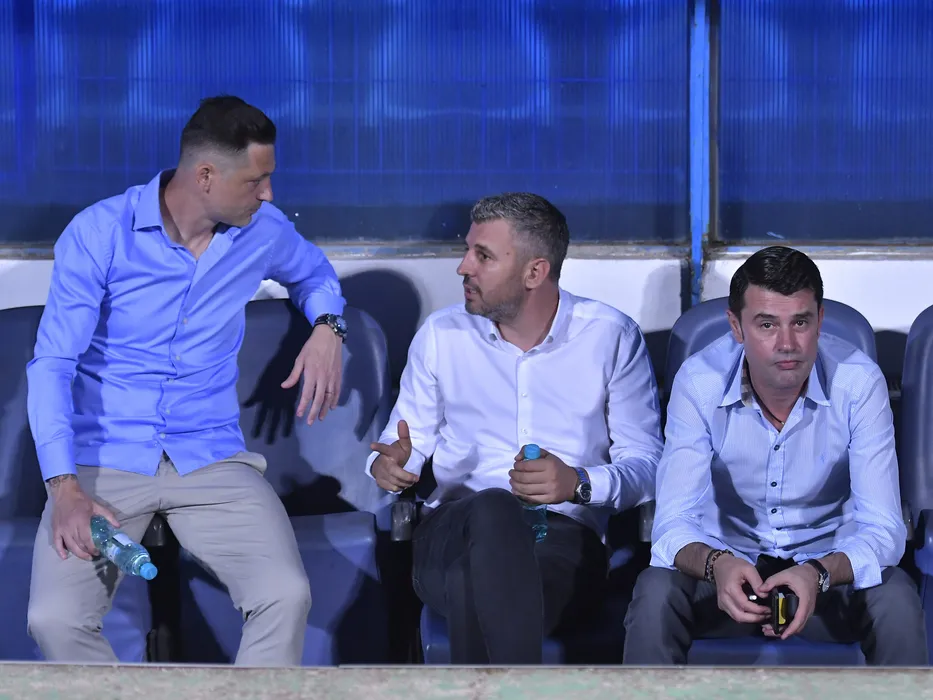 Mirel Radoi Emil Pieleanu si Marian Copilu discuta inaintea meciului de fotbal dintre Universitatea Craiova si FC Botosani, contand pentru Superliga Superbet, desfasurat pe Stadionul Municipal din Drobeta Turnu Severin, luni 29 august 2022. © FOTO:Razvan Pasarica/SPORT PICTURES