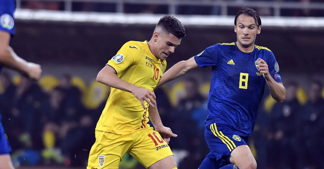 Ianis Hagi si Albin Ekdal in meciul de fotbal dintre Romania si Suedia, contand pentru Preliminariile Campionatului European 2020, desfasurat pe Arena Nationala din Bucuresti, vineri 15 noiembrie 2019. © FOTO:Razvan Pasarica/SPORT PICTURES