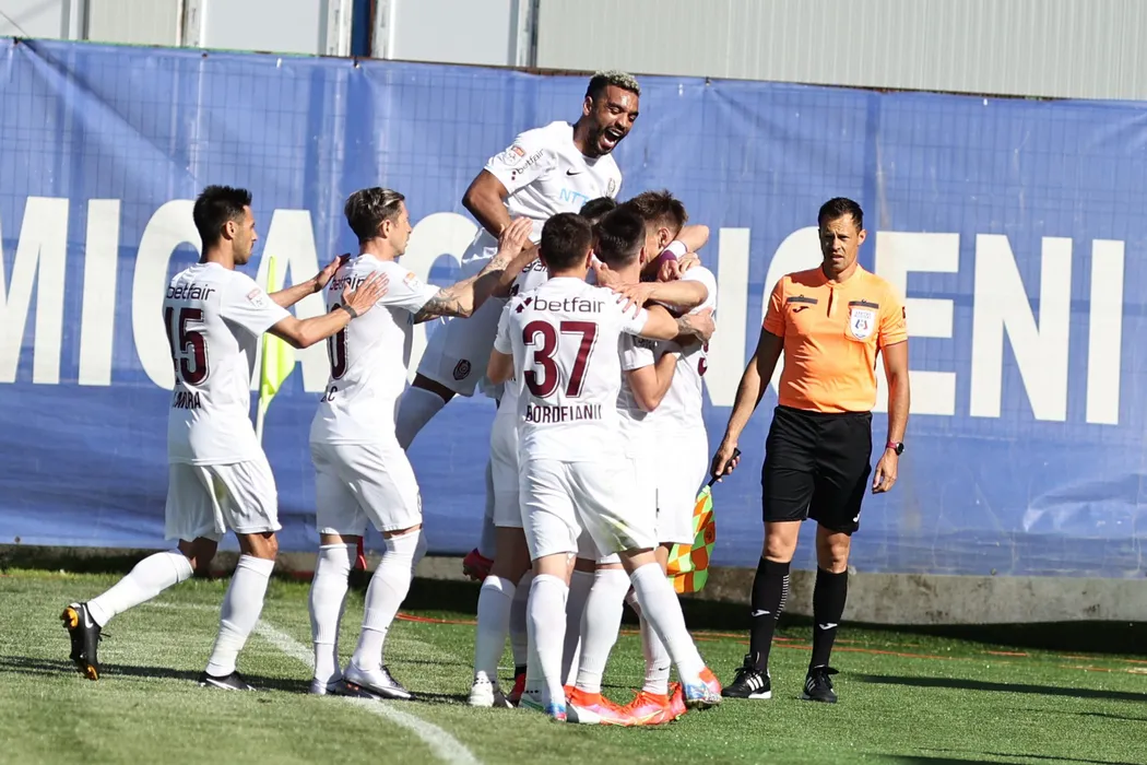 Fotbalistii clujeni se bucura dupa un gol marcat in meciul de fotbal dintre Academica Clinceni si CFR Cluj, contand pentru Liga 1 Casa Pariurilor, desfasurat pe Clinceni Arena din Clinceni, joi 06 mai 2021. © FOTO:Gheorghe Fluster/SPORT PICTURES