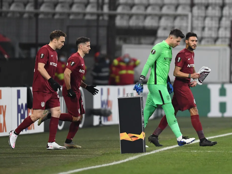 Fotbalistii clujeni Gabriel Debeljuh, Alexandru Mihaita Chipciu, Cristian Balgradean si Mario Camora intra pe teren la meciul de fotbal dintre CFR Cluj si TSKA Sofia din cadrul grupei A a Ligii Europa, disputat fara spectatori pe stadionul Dr. Constantin Radulescu din Cluj-Napoca, joi 3 decembrie 2020. © FOTO:Flaviu Buboi / Sport Pictures