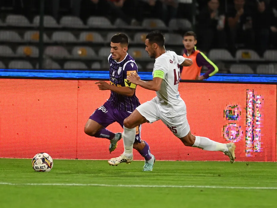 Costinel Andrei Tofan si Mario Camora in meciul de fotbal dintre FC Arges si CFR Cluj, contand pentru Superliga Superbet, desfasurat pe Stadionul Nicolae Dobrin din Pitesti, luni 19 septembrie 2022. © FOTO:Razvan Pasarica/SPORT PICTURES