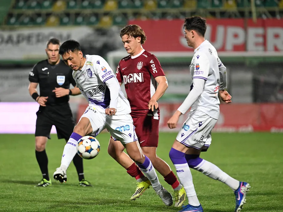 Takayuki Seto si Lorenzo Biliboc in meciul de fotbal dintre FC Arges si CFR Cluj, contand pentru Play off-ul Superligii Superbet, desfasurat pe Stadionul Orasenesc din Mioveni, vineri 17 aprilie 2026. © FOTO:Razvan Pasarica/SPORT PICTURES