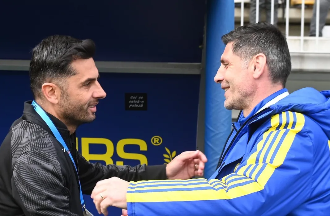Cei doi antrenori Nicolae Dica si Florin Cristian Parvu se saluta inaintea meciului de fotbal dintre Petrolul Ploiesti si CS Mioveni, contand pentru Play-out-ul Superligii Superbet, desfasurat pe Stadionul Ilie Oana din Ploiesti, luni 10 aprilie 2023.,Image: 768573400, License: Rights-managed, Restrictions: , Model Release: no