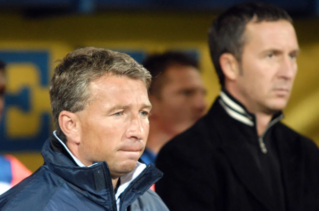 Antrenorul echipei FC Unirea Urziceni, Dan Petrescu (S), si managerul Mihai Stoica (D) urmaresc meciul cu Gaz Metan Medias, din cadrul etapei a IX-a a Ligii I, in Medias, sambata, 3 octombrie 2009. RAUL STEF / MEDIAFAX FOTO