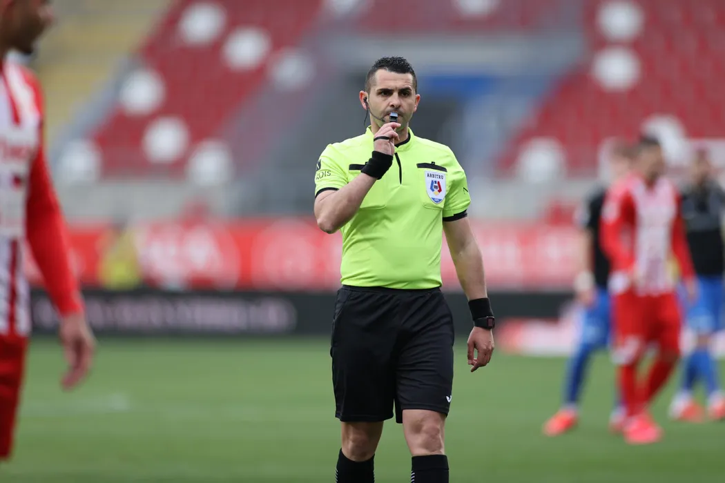 Arbitrul Iulian Calin reactioneaza in partida de fotbal din play out-ul Ligii I dintre UTA Arad si FC Viitorul Constanta, pe stadionul Francisc Neuman din Arad, vineri 16 aprilie 2021. SEBASTIAN TATARU / MEDIAFAX FOTO