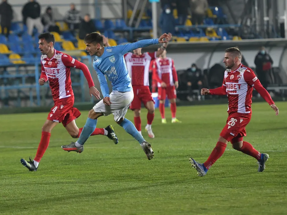 Ion Gheorghe marcheaza un gol de langa Andre Almeida Pinto si Petar Gluhakovic in meciul de fotbal dintre FC Voluntari si Dinamo Bucuresti, contand pentru Liga 1 Casa Pariurilor, desfasurat pe Stadionul Anghel Iordanescu din Voluntari, luni 22 noiembrie 2021. © FOTO:Razvan Pasarica/SPORT PICTURES