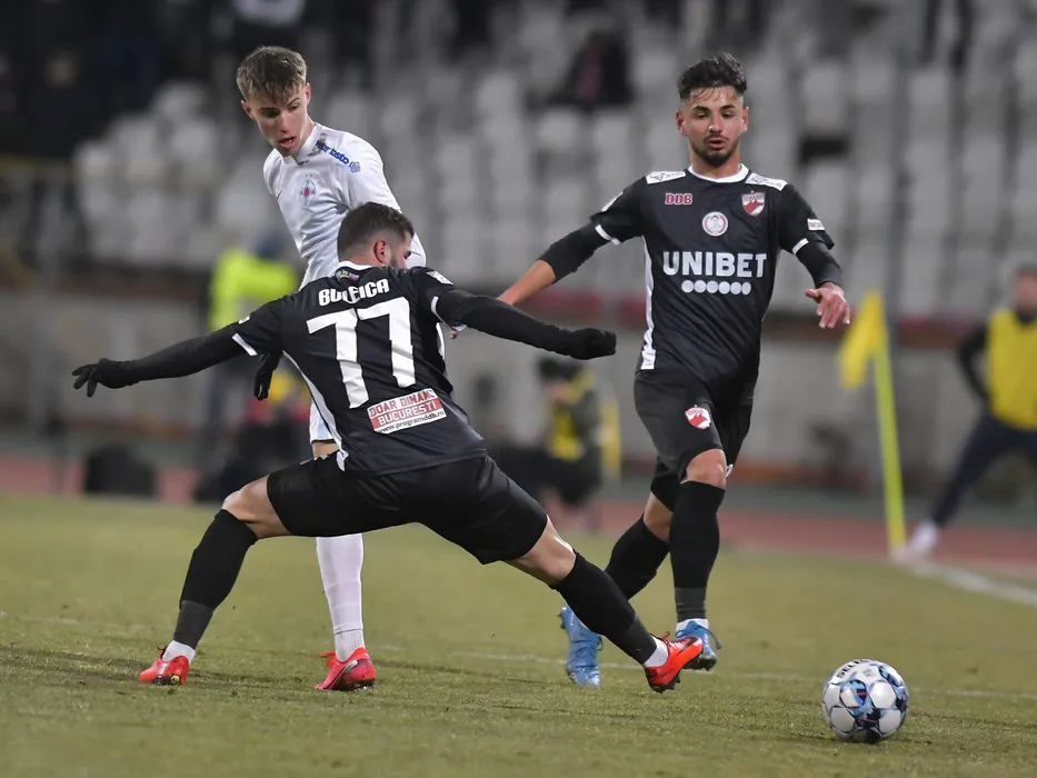 Octavian George Popescu, Alin Florian Buleica si Antonio Alexandru Bordusanu in meciul de fotbal dintre Dinamo Bucuresti si FCSB contand pentru Liga 1 Casa Pariurilor, desfasurat pe Stadionul Dinamo din Bucuresti, duminica 30 ianuarie 2022. © FOTO:Razvan Pasarica/SPORT PICTURES