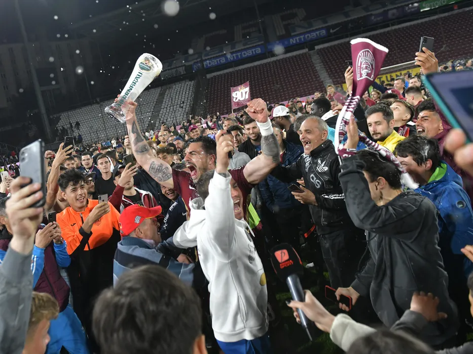 Bucurie clujeana cu Andonie Andrei Burca dupa castigarea campionatului in urma meciului de fotbal dintre CFR Cluj si Universitatea Craiova, contand pentru Play-off-ul Ligii 1 Casa Pariurilor, desfasurat pe Stadionul CFR Dr. Constantin Radulescu din Cluj Napoca, duminica 15 mai 2022. © FOTO:Razvan Pasarica/SPORT PICTURES