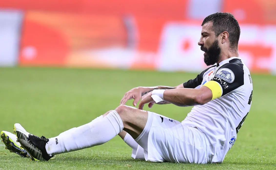 Marius Marcel Constantin la pamant in meciul de fotbal dintre FCSB si Gaz Metan Medias, contand pentru play-off-ul Ligii 1 Casa Pariurilor, disputat fara spectatori pe Arena Nationala din Bucuresti, duminica 21 iunie 2020. © FOTO:Razvan Pasarica/SPORT PICTURES
