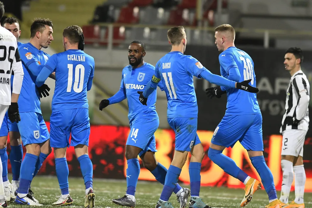 Bucurie a fotbalistilor craioveni dupa un gol marcat cu Alexandru Mateiu, Alexandru Cicalda, Reagy Ofosu si Ivan Mamut in meciul de fotbal dintre Astra Giurgiu si Universitatea Craiova, contand pentru Liga 1 Casa Pariurilor, desfasurat fara spectatori pe Stadionul Marin Anastasovici din Giurgiu, luni 18 ianuaie 2021. © FOTO:Razvan Pasarica/SPORT PICTURES