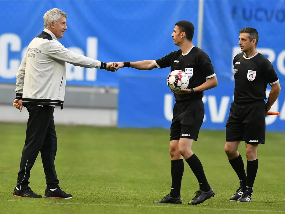 Cristiano Bergodi alaturi de arbitrul central Marcel Birsan si Marius Nicoara in meciul de fotbal dintre Universitatea Craiova si FC Botosani, contand pentru play-off-ul Ligii 1 Casa Pariurilor, disputat fara spectatori pe Stadionul Ion Oblemenco din Craiova, marti 23 iunie 2020. © FOTO:Razvan Pasarica/SPORT PICTURES