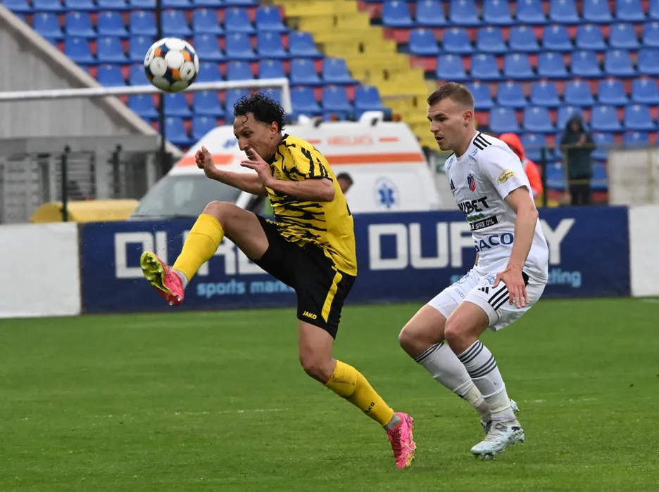 Yassine Mohammed Zakir si Riad Suta in meciul de fotbal dintre FC Botosani si FC Metaloglobus Bucuresti, contand pentru Superliga Superbet Play-Out, desfasurat pe Stadionul Municipal din Botosani, luni 20 aprilie 2026. © FOTO:Tudy/SPORT PICTURES