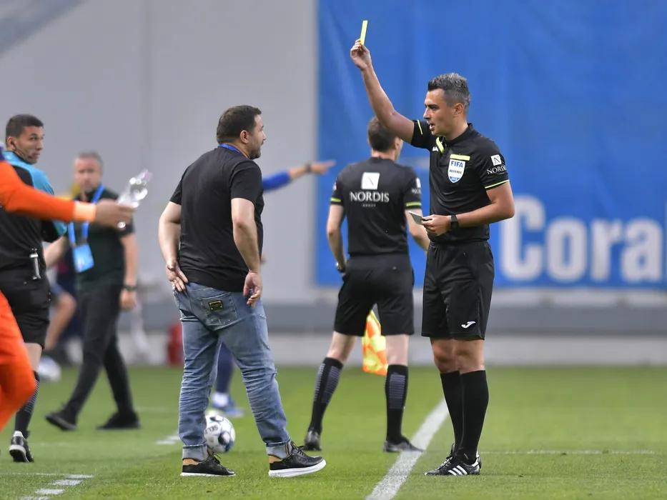 Arbitrul central Horatiu Mircea Fesnic acorda un cartonas galben lui Marius Croitoru in meciul de fotbal dintre Universitatea Craiova si FC Botosani, contand pentru Barajul Europa Conference League, desfasurat pe Stadionul Ion Oblemenco din Craiova, vineri 27 mai 2022. © FOTO:Razvan Pasarica/SPORT PICTURES