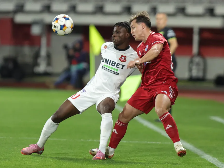 Nana Kwame Antwi si Holz Conrado Buchanelli in meciul de fotbal dintre AFC Hermannstadt Sibiu si SC Otelul Galati, contand pentru Superliga Superbet, desfasurat pe Stadionul Municipal din Sibiu, duminica 2 noiembrie 2025. © FOTO:Sorin Pana/SPORT PICTURES