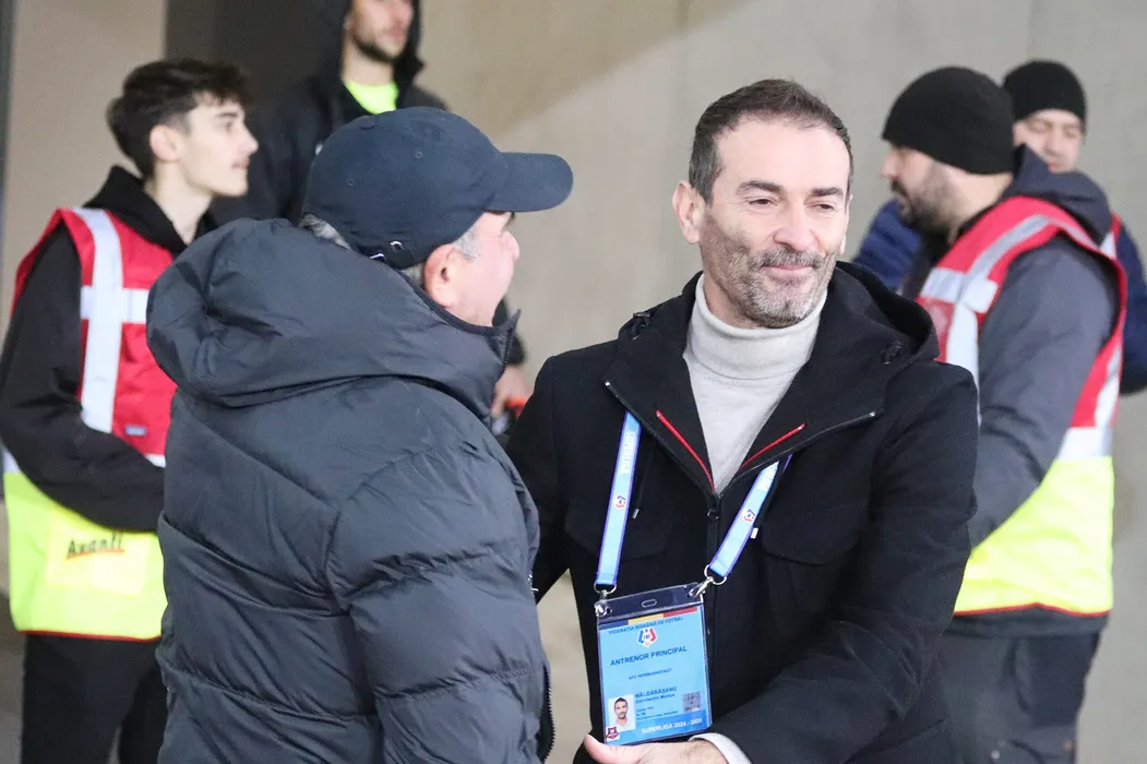 Cei doi antrenori Marius Măldărașanu și Ovidiu Ioan Sabău se salută înaintea meciului de fotbal dintre AFC Hermannstadt Sibiu si FArul Constanța, petru Cupa României Betano, desfășurat pe Stadionul Municipal din Sibiu, marți 3 decembrie 2024. © FOTO: Valentin MACREA/SPORT PICTURES