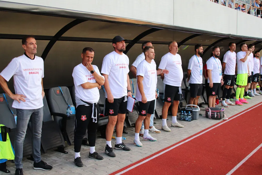 Banca de rezerve sibiana la inceputul meciului de fotbal dintre AFS HERMANNSTADT SIBIU si SEPSI OSK SFANTU GHEORGHE contand pentru CUPA ROMANIEI BETANO, desfasurat pe Stadionul Municipal din Sibiu, miercuri 27 septembrie 2023. © FOTO: Valentin MACREA/SPORT PICTURES