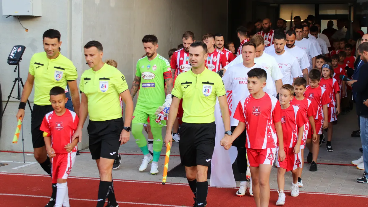 Echipele intra pe teren in meciul de fotbal dintre AFS HERMANNSTADT SIBIU si SEPSI OSK SFANTU GHEORGHE contand pentru CUPA ROMANIEI BETANO, desfasurat pe Stadionul Municipal din Sibiu, miercuri 27 septembrie 2023. © FOTO: Valentin MACREA/SPORT PICTURES