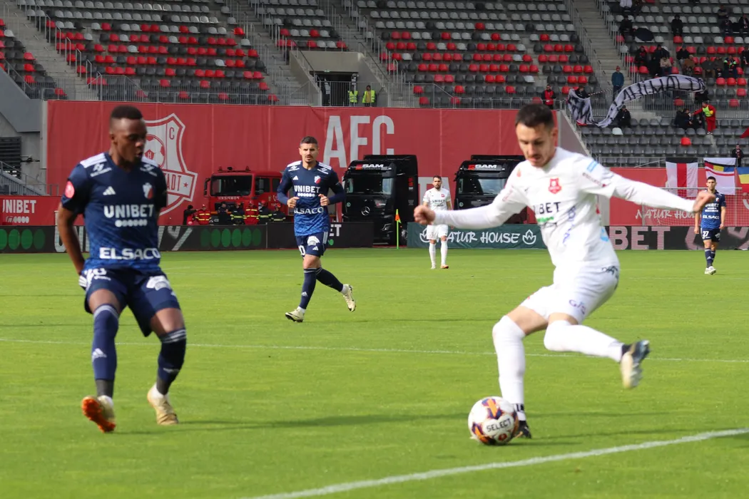 Raul Marian Opruț și Charles Petro în meciul de fotbal dintre AFC Hermannstadt Sibiu si FC Botoșani, contând pentru Superliga Superbet Play-Out, desfășurat pe Stadionul Municipal din Sibiu, vineri 19 aprilie 2024. © FOTO: Valentin MACREA/SPORT PICTURES