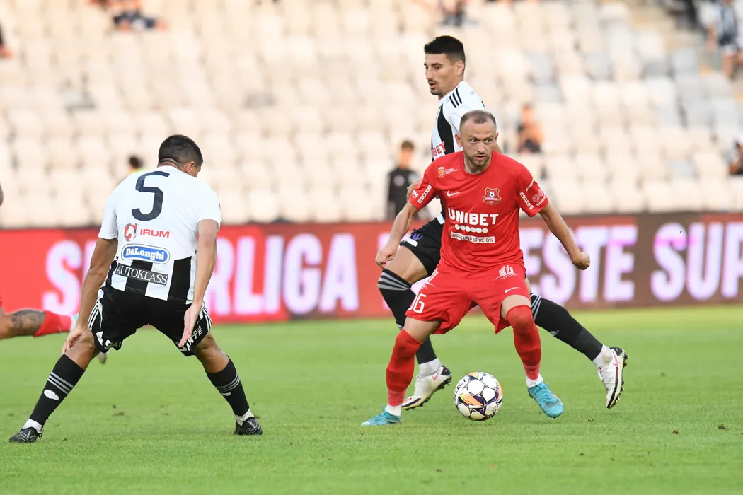 Silviu Nicolae Balaure și Lucian Iulian Cristea în meciul de fotbal dintre FC Universitatea Cluj și AFC Hermannstadt contând pentru SUPERLIGA SUPERBET, desfășurat pe Stadionul CLUJ ARENA din Cluj-Napoca, duminică 21 iulie 2024. © FOTO: Flaviu BUBOI/SPORT PICTURES