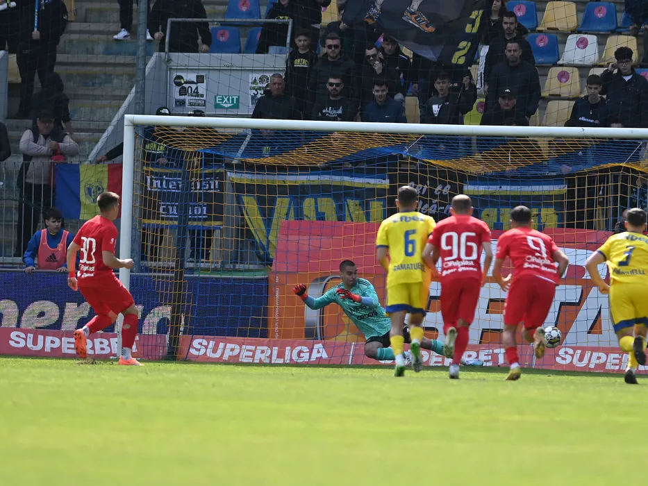 George Daniel Paraschiv marcheaza un gol din penalty in poarta lui Octavian Gabriel Valceanu in meciul de fotbal dintre Petrolul Ploiesti si FC Hermannstadt, contand pentru Play-out-ul Superligii Superbet, desfasurat pe Stadionul Ilie Oana din Ploiesti,sambata 13 mai 2023. © FOTO:Razvan Pasarica/SPORT PICTURES