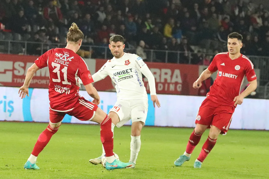 Ciprian Ionuț Biceanu și George Cîrjan în meciul de fotbal dintre AFC Hermannstadt Sibiu și SC Oțelul Galați, contând pentru Superliga Superbet, desfășurat pe Stadionul Municipal din Sibiu, sâmbătă 2 martie 2024. © FOTO: Valentin MACREA/SPORT PICTURES