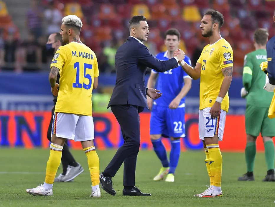 Mirel Radoi alaturi de Marius Marin si Virgil Ghiţă, debutanti in echipa nationala, dupa meciul de fotbal dintre Romania si Liechtenstein, contand pentru Preliminariile CM 2022, desfasurat pe Arena Nationala din Bucuresti, duminica 5 septembrie 2021. © FOTO:Razvan Pasarica/SPORT PICTURES