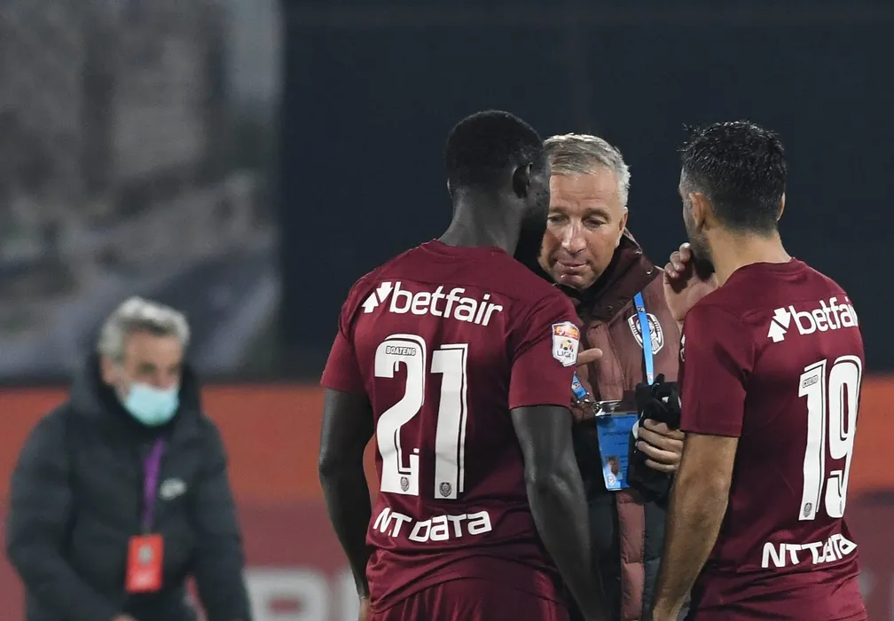 Dan Petrescu, Bismarck Adjei-Boateng si Emmanuel Culio in meciul de fotbal dintre CFR Cluj si FC Voluntari, contand pentru Liga 1 Casa Pariurilor, desfasurat fara spectatori pe Stadionul Dr. Constantin Radulescu din Cluj Napoca, sambata 30 octombrie 2021. © FOTO:Flaviu Buboi/SPORT PICTURES